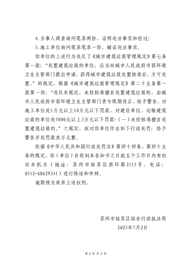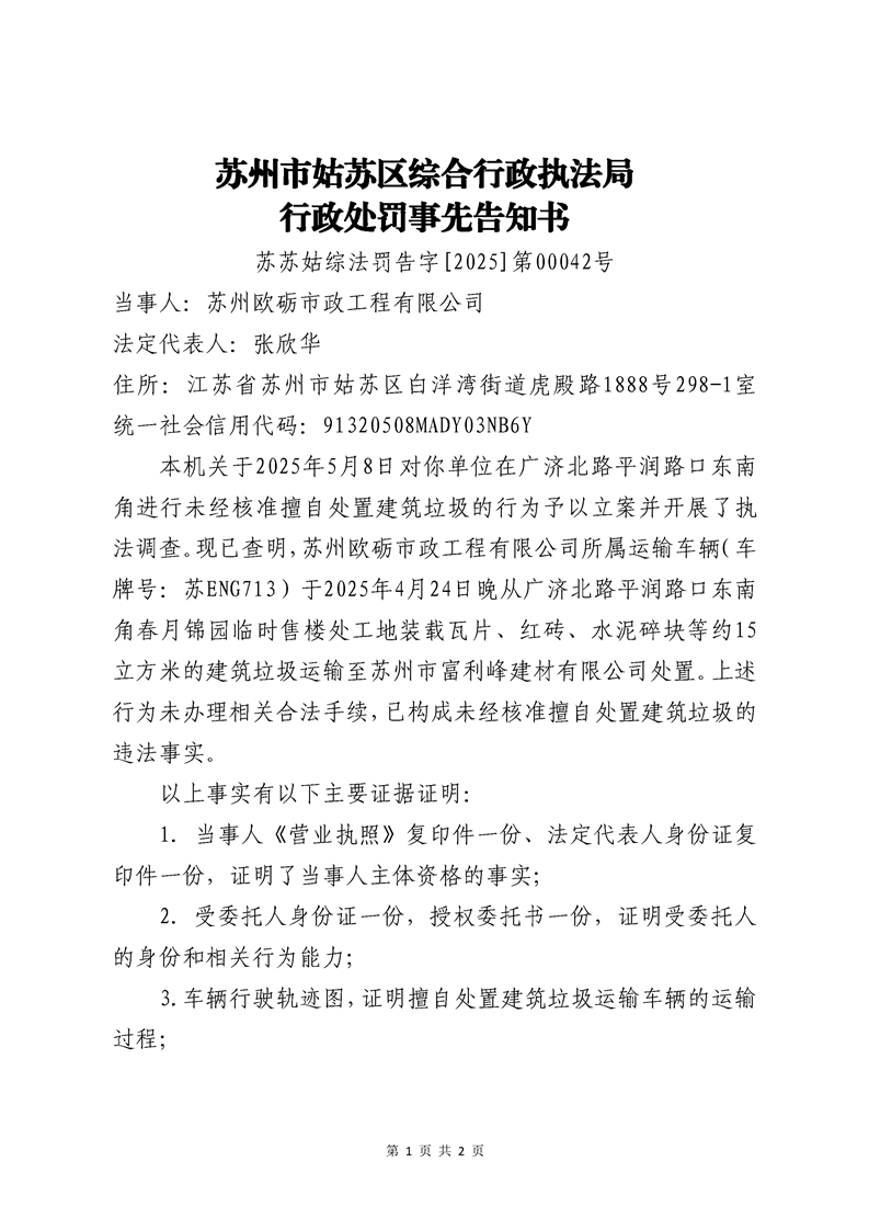 蘇州歐礪市政工程有限公司未經(jīng)核準(zhǔn)擅自處置建筑垃圾案行政處罰事先告知書(shū)送達(dá)公告