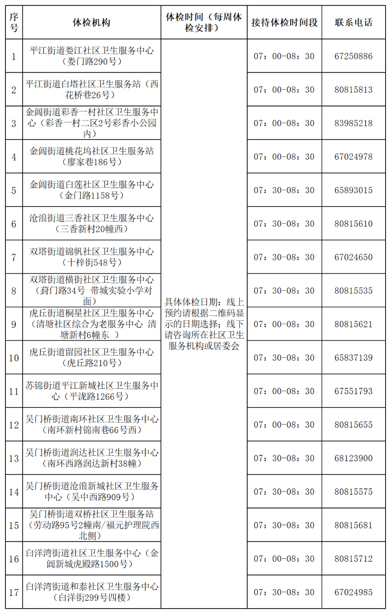 5.如遇特殊情況不能在指定日期參加體檢,請(qǐng)與《體檢通知單》中“所在社區(qū)”的社區(qū)退管協(xié)理員聯(lián)系,由社區(qū)退管協(xié)理員登記匯總后與指定體檢機(jī)構(gòu)確定體檢再安排時(shí)間。2025年免費(fèi)健康體檢工作于2025年12月結(jié)束,逾期未體檢的視作自動(dòng)放棄。本年度已經(jīng)體檢的不能重復(fù)體檢。