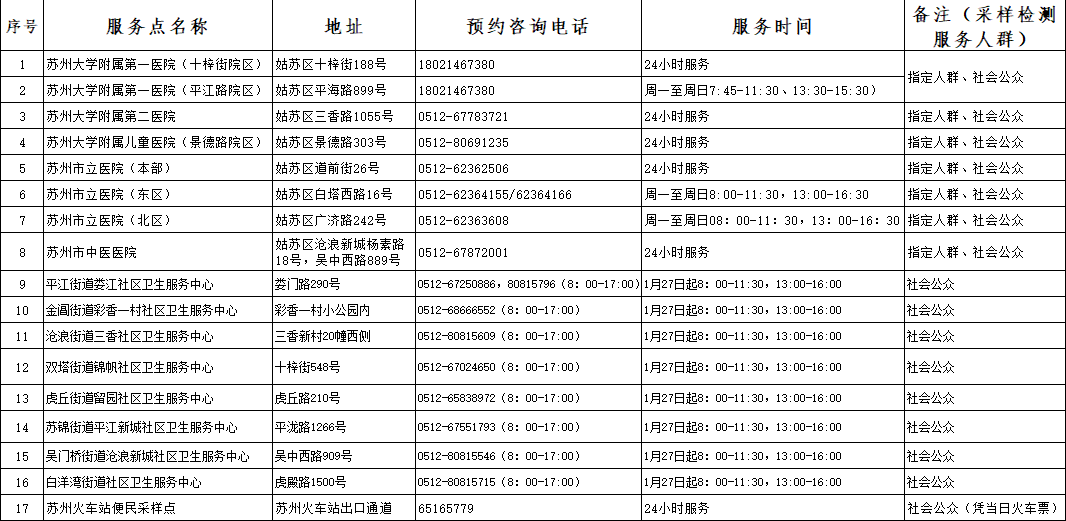 春節(jié)臨近,返鄉(xiāng)人員增多、人員流動(dòng)頻繁,外省來(lái)蘇人員和本地返鄉(xiāng)人員,核酸檢測(cè)需求量大幅增加。為進(jìn)一步滿足群眾檢測(cè)需求,即日起,保護(hù)區(qū)、姑蘇區(qū)新增一批便民采樣點(diǎn),為市民就近獲得核酸檢測(cè)服務(wù)提供便利。在社區(qū)衛(wèi)生服務(wù)中心增設(shè)8個(gè)采樣艙服務(wù)點(diǎn)(1月27日啟用),對(duì)社會(huì)大眾提供就近便民采樣服務(wù)。根據(jù)火車(chē)站春運(yùn)客流情況,在火車(chē)站北廣場(chǎng)增設(shè)8個(gè)采樣單元、新增1輛應(yīng)急監(jiān)測(cè)采樣車(chē),對(duì)進(jìn)、出站需核酸檢測(cè)旅客進(jìn)行合理分流,盡可能減少現(xiàn)場(chǎng)人員聚集。全區(qū)還有8家醫(yī)院提供核酸檢測(cè)服務(wù),居民可通過(guò)“蘇州衛(wèi)生12320”官方微信公眾號(hào)、“健康蘇州掌上行”APP、“蘇周到”APP進(jìn)行預(yù)約檢測(cè)。除此之外,全區(qū)還有中高風(fēng)險(xiǎn)所在低風(fēng)險(xiǎn)地區(qū)人群采樣點(diǎn)1個(gè)、“應(yīng)檢盡檢”人群采樣點(diǎn)8個(gè)由屬地街道社區(qū)預(yù)約后采樣。