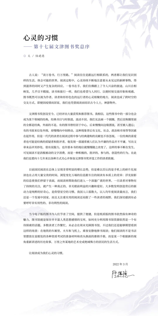 以閱讀之名,共赴春光盛宴。2022年4·23世界讀書日當天,第十七屆文津圖書獎正式揭曉。